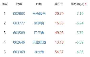 吉宏股份、来伊份、口子窖、天佑德酒、今世缘位列涨幅榜后五位,涨幅分别为-7.19%、-6.24%、-5.79%、-5.59%、-4.86%。