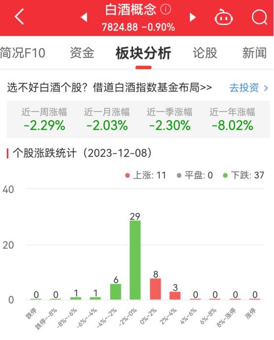 中国经济网北京12月8日讯今日,白酒概念板块整体跌幅0.90%,其中11只股票上涨,0只股票平盘,37只股票下跌。