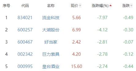 流金科技、大湖股份、好当家、巨力索具、皇台酒业位列涨幅榜后五位,涨幅分别为-7.97%、-4.12%、-2.81%、-2.78%、-2.74%。