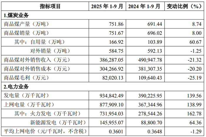 在电力业务方面,发电量为93.48亿千瓦时,同比增长139.56%;上网电量为87.79亿千瓦时,同比增长138.99%;平均上网电价为0.3601元/千瓦时,同比下降1.29%。具体数据如下: