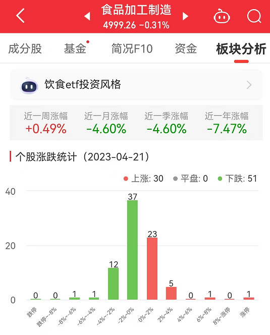 中国经济网北京4月21日讯 今日,食品加工制造板块整体跌幅0.31%,其中,30只股票上涨,51只股票下跌。