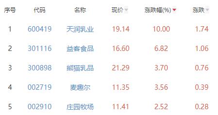 其中,天润乳业、益客食品、熊猫乳品、麦趣尔、庄园牧场位列板块涨幅前五位,涨幅分别为10.00%、6.82%、3.70%、3.56%、2.52%。