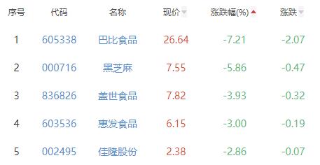 巴比食品、黑芝麻、盖世食品、惠发食品、佳隆股份位列涨幅榜后五位,涨幅分别为-7.21%、-5.86%、-3.93%、-3.00%、-2.86%。