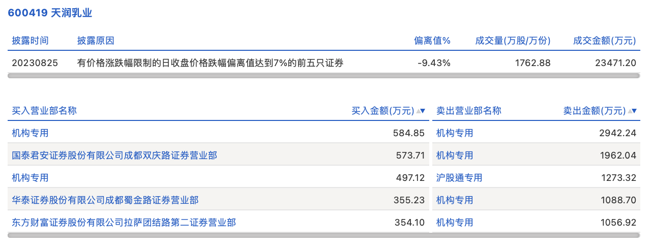 8月25日,天润乳业今日跌停,龙虎榜数据显示,上榜营业部席位全天成交1.07亿元,占当日总成交金额比例为45.54%。其中,买入金额为2365.01万元,卖出金额为8323.22万元,合计净卖出5958.21万元。