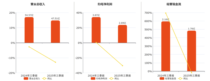 公司营业总收入为47.51亿元,较去年同报告期营业总收入减少10.49亿元,同比较去年同期下降18.08%。归母净利润为2.69亿元,较去年同报告期归母净利润减少1.75亿元,同比较去年同期下降39.42%。经营活动现金净流入为1.76亿元,较去年同报告期经营活动现金净流入减少1.94亿元,同比较去年同期下降52.43%。