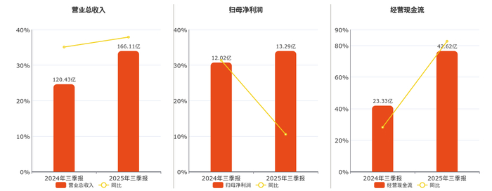 公司营业总收入为166.11亿元,较去年同报告期营业总收入增加45.67亿元,实现2年连续上涨,同比较去年同期上涨37.92%。归母净利润为13.29亿元,较去年同报告期归母净利润增加1.27亿元,实现5年连续上涨,同比较去年同期上涨10.54%。经营活动现金净流入为42.62亿元,较去年同报告期经营活动现金净流入增加19.29亿元,实现5年连续上涨,同比较去年同期上涨82.69%。