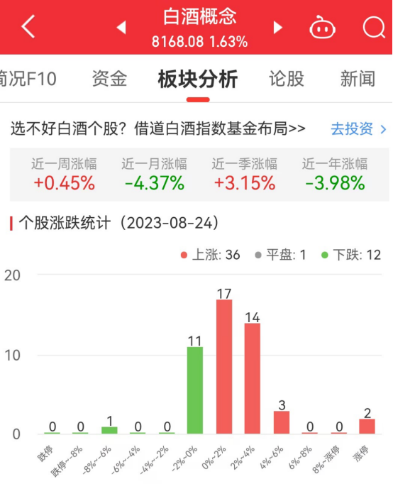 中国经济网北京8月24日讯今日,白酒概念板块整体涨幅1.63%,其中36只股票上涨,1只股票平盘,12只股票下跌。