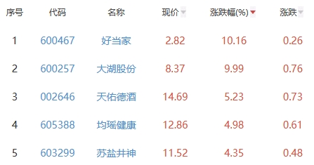 其中,好当家、大湖股份、天佑德酒、均瑶健康、苏盐井神位列板块涨幅前五位,涨幅分别为10.16%、9.99%、5.23%、4.98%、4.35%。