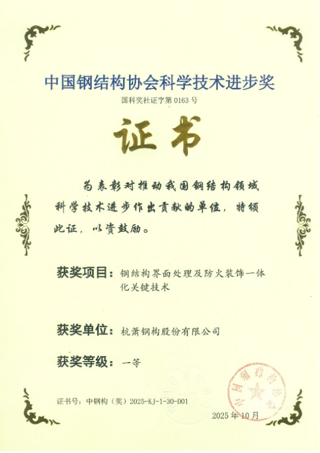 荣誉证书此次获奖,不仅是对杭萧钢构技术研发实力与创新成果的高度认可,也对企业持续推动钢结构行业的技术进步产生了积极作用。目前,该技术成果已形成行业标准1项、中国工程建设标准化协会标准2项,获得多项发明及实用新型专利。