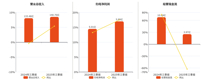 公司营业总收入为140.70亿元,较去年同报告期营业总收入增加7.22亿元,同比较去年同期上涨5.41%。归母净利润为5.88亿元,较去年同报告期归母净利润增加8747.62万元,实现5年连续上涨,同比较去年同期上涨17.47%。经营活动现金净流入为3.97亿元。