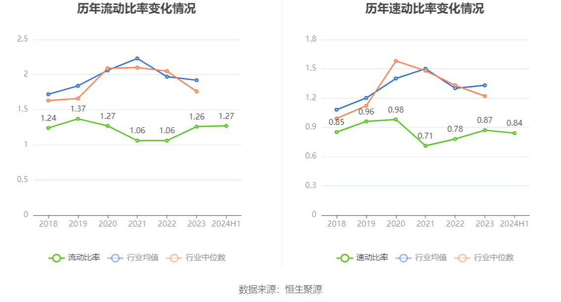 2024年上半年,公司流动比率为1.27,速动比率为0.84。