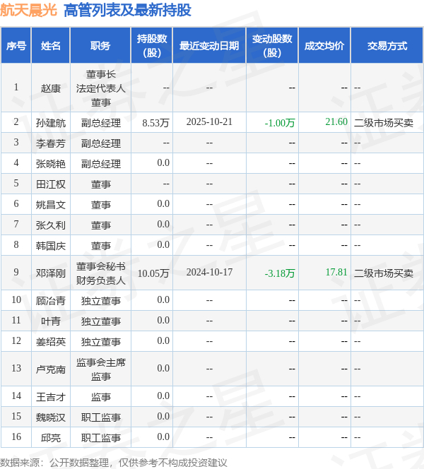 航天晨光的高管列表及最新持股情况如下: