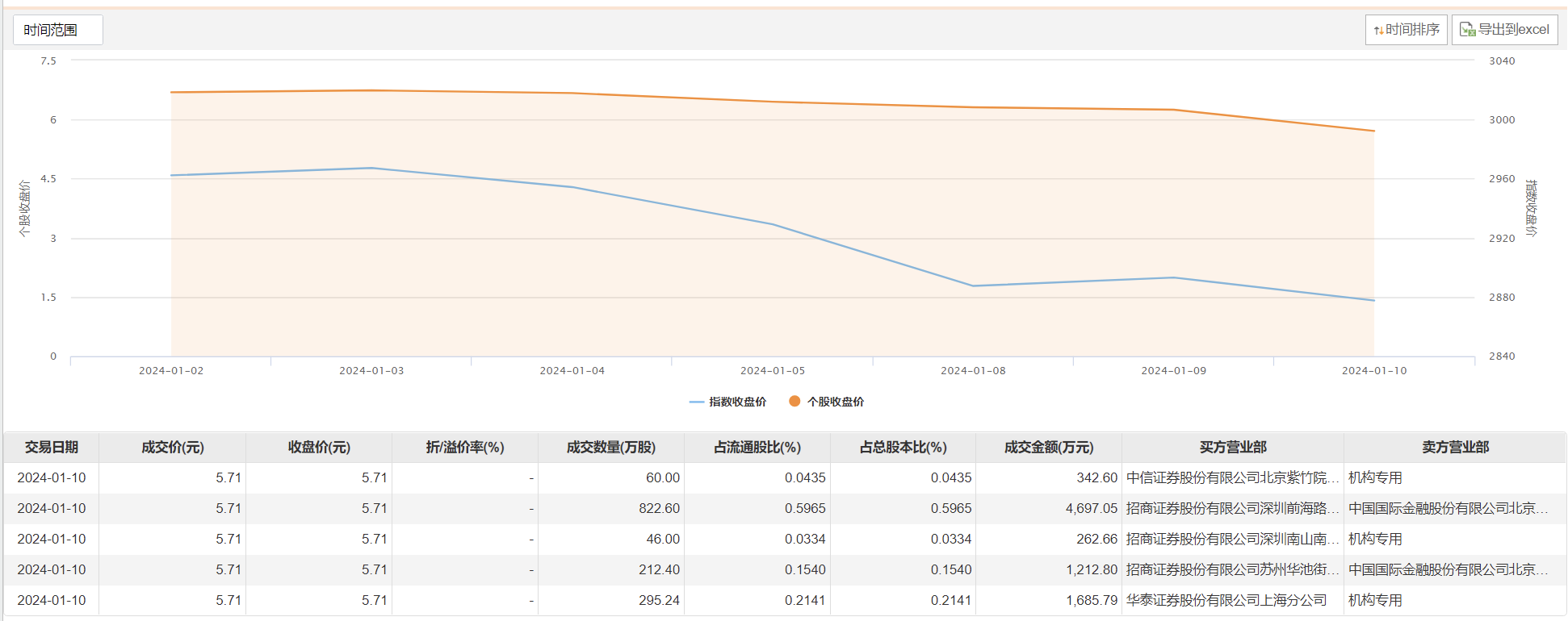 今日大宗交易成交1436.24万股,成交额8200.9万元,占当日总成交额的18.79%,成交价5.71元,较市场收盘价持平。