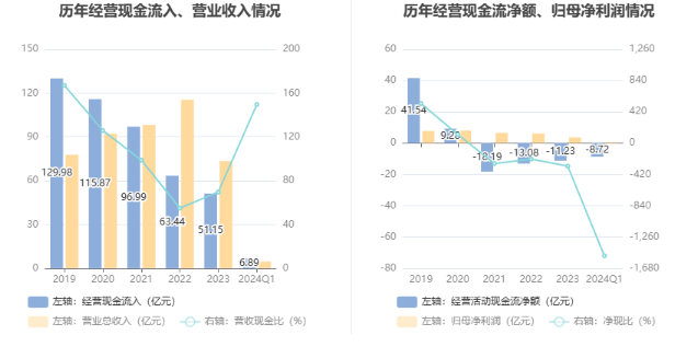2024年第一季度,公司经营活动现金流净额为-8.72亿元,同比增加2959.78万元;筹资活动现金流净额-2.95亿元,同比减少6.24亿元;投资活动现金流净额-1040.70万元,上年同期为-164.22万元。