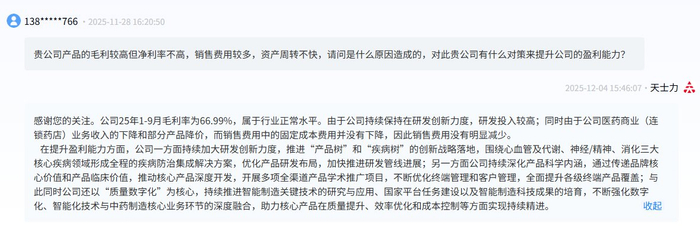 来源:上证路演平台,下同天士力对此回应称,公司2025年1-9月毛利率为66.99%,属于行业正常水平。由于公司持续保持在研发创新力度,研发投入较高;同时由于公司医药商业(连锁药店)业务收入的下降和部分产品降价,而销售费用中的固定成本费用并没有下降,因此销售费用没有明显减少。