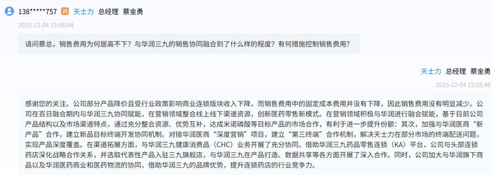 互动交流部分,同样有投资者针对销售费用为何居高不下进行提问,并问及公司与华润三九的销售协同融合到了什么样的程度,有何措施控制销售费用。