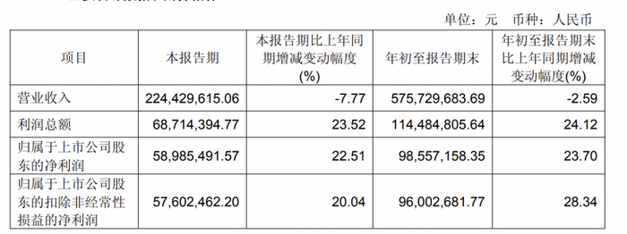 2025年前三季度,惠泉啤酒营业收入5.76亿元,同比下滑2.59%;归母净利润9855.72万元,同比增长23.7%。其中第三季度营业收入2.24亿元,同比下滑7.77%;归母净利润5898.55万元,同比增长22.51%。