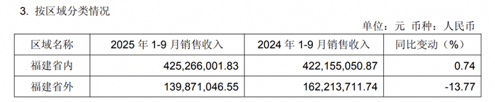 按区域分类情况来看,福建市场依旧是惠泉啤酒的“大本营”。今年前三季度,福建省内销售收入为4.25亿元,同比增长0.74%;福建省外销售收入1.4亿元,同比下降13.77%。