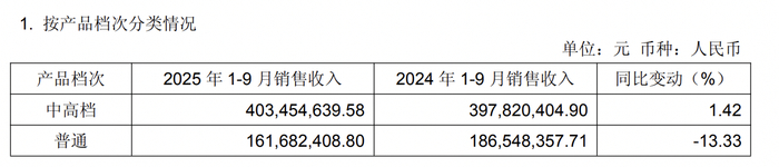 按产品档次分类情况来看,今年前三季度,公司中高档产品销售收入为4.03亿元,同比增长1.42%;普通产品销售收入为1.62亿元,同比下降13.33%。