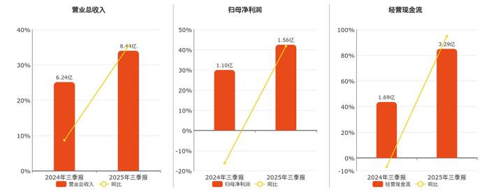 公司营业总收入为8.44亿元。归母净利润为1.56亿元。经营活动现金净流入为3.29亿元。