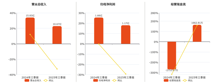公司营业总收入为10.67亿元,较去年同报告期营业总收入减少3.05亿元,同比较去年同期下降22.23%。归母净利润为1.17亿元,较去年同报告期归母净利润减少4865.27万元,同比较去年同期下降29.38%。经营活动现金净流入为1662.81万元,较去年同报告期经营活动现金净流入增加4416.48万元。