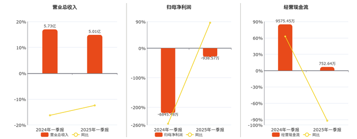 公司营业总收入为5.01亿元,较去年同报告期营业总收入减少7116.53万元,同比较去年同期下降12.43%。归母净利润为-938.57万元。经营活动现金净流入为752.64万元,较去年同报告期经营活动现金净流入减少8822.82万元,同比较去年同期下降92.14%。