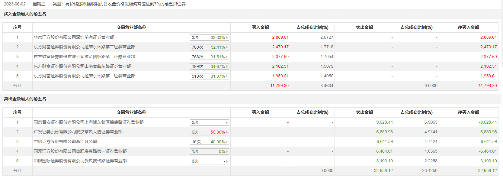 具体来看,华泰证券深圳前海证券营业部、东方财富证券拉萨东环路第二证券营业部分别买入2889.61万元、2470.17万元;国泰君安证券上海浦东新区锦康路证券营业部、广发证券武汉京汉大道证券营业部分别卖出9628.44万元、6850.98万元。