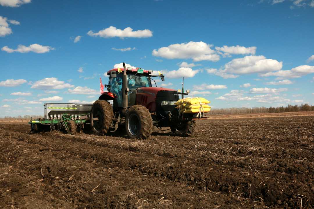 集团五大连池农场第一作业区,一台大马力机车正在为玉米地施肥。连日来,广袤的北大荒,春潮涌动,机声轰鸣,奏响了春播“曲”。