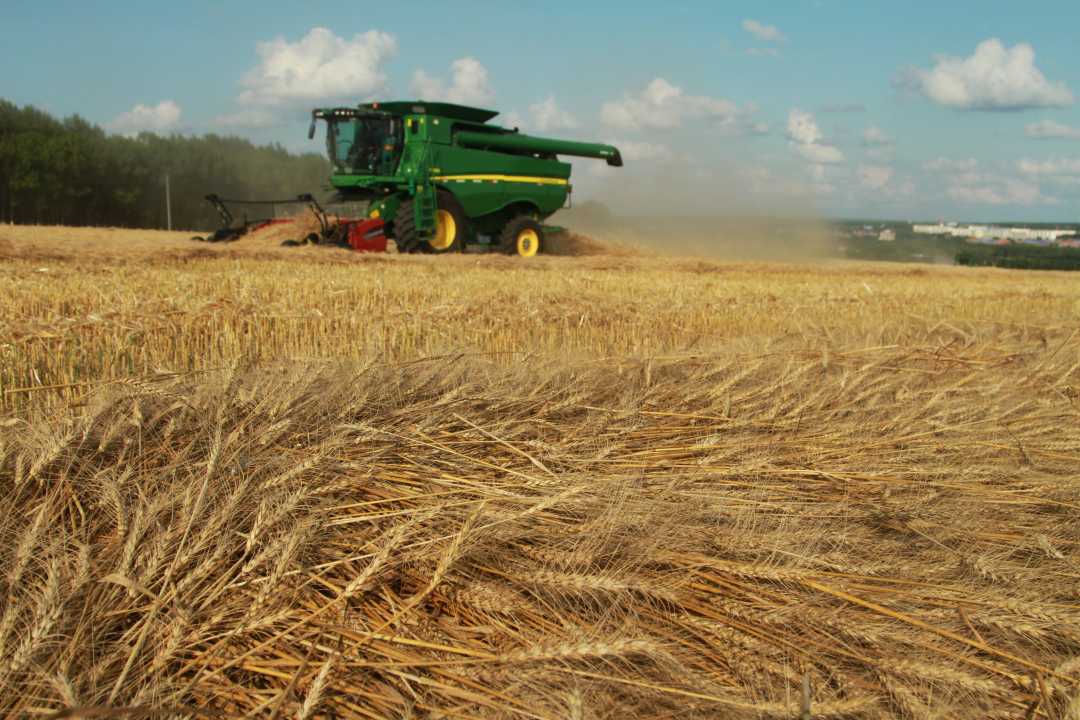 集团红五月农场有限公司一块小麦田里,大型收割机正进行小麦拾禾作业,抢收小麦,确保颗粒归仓。