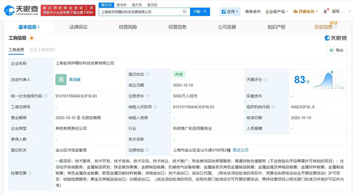天眼查App显示,近日,上海老凤祥精材科技发展有限公司成立,法定代表人为高奇峰,注册资本5000万人民币,经营范围包括珠宝首饰回收修理服务、普通货物仓储服务、金属链条及其他金属制品销售等,由上海老凤祥首饰研究所有限公司、深圳市翠绿首饰股份有限公司、上海鑫派铂族贵金属有限公司共同持股。