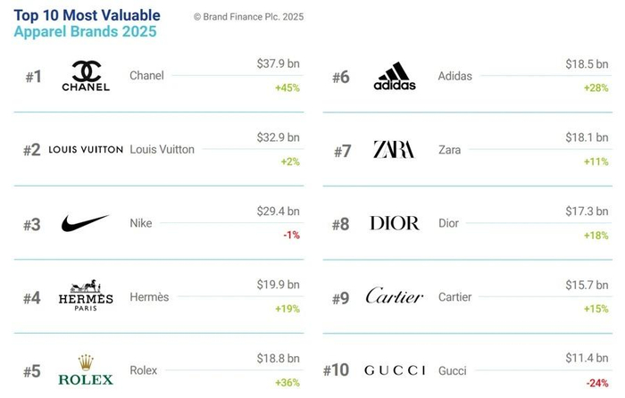 DoNews10月11日消息,英国品牌评估机构“品牌金融”(Brand Finance)发布2024“全球服饰品牌价值50强”排行榜(Apparel 50 2024),香奈儿升至首位,路易威登、耐克名列第二、三名。前十名中有一半为法国品牌。中国(包括大陆和香港地区)共有四个品牌上榜,分别是周大福、安踏、老凤祥和波司登。