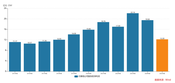 2024年,老凤祥营业收入同比下降20.5%至567.93亿元,归母净利润下滑近12%至19.5亿元。2025年上半年,营收进一步降至334亿元,同比下降16.5%;归母净利润为12.2亿元,同比降幅13%。