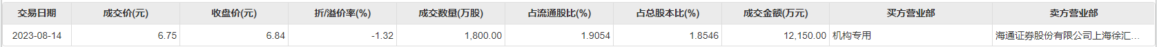 8月14日大宗交易成交1800万股,成交额1.22亿元,占当日总成交额的47.76%,成交价6.75元,较市场收盘价6.84元折价1.32%。