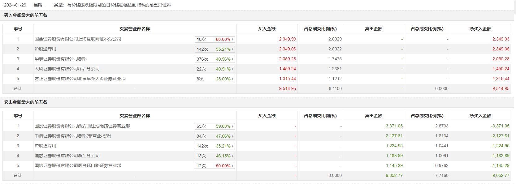 1月29日,华建集团今日跌停,全天换手率达18.58%,振幅达20.12%。龙虎榜数据显示,营业部席位合计净买入462.18万元。其中,国投证券西安曲江池南路证券营业部、中信证券总部(非营业场所)分别卖出3371.05万元、2127.61万元;国金证券上海互联网证券分公司、沪股通专用分别买入2349.93万元、2349.06万元。