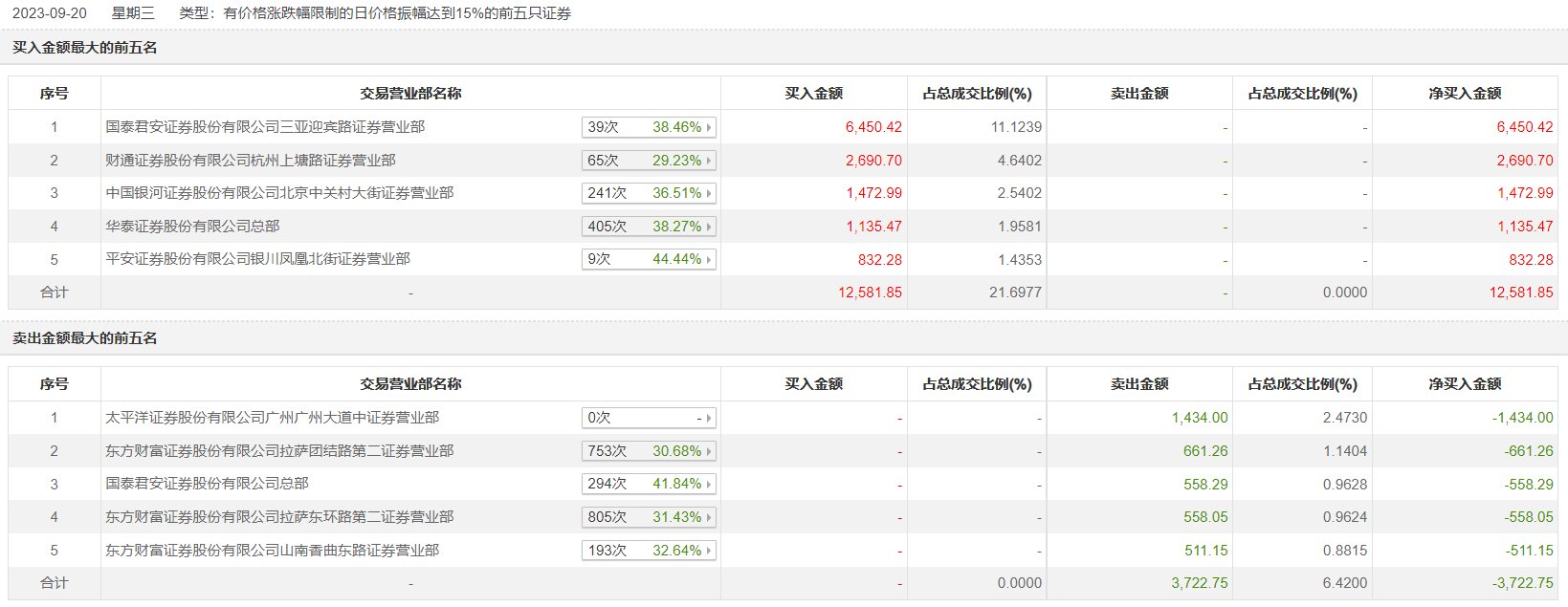 具体来看,国泰君安证券三亚迎宾路证券营业部、财通证券杭州上塘路证券营业部分别买入6450.42万元、2690.70万元;太平洋证券广州广州大道中证券营业部、东方财富证券拉萨团结路第二证券营业部分别卖出1434.00万元、661.26万元。