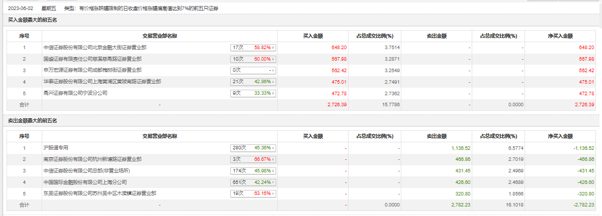 具体来看,中信证券北京金融大街证券营业部、国盛证券慈溪慈甬路证券营业部分别买入648.20万元、567.98万元;沪股通专用、南京证券杭州新塘路证券营业部分别卖出1136.52万元、466.86万元。