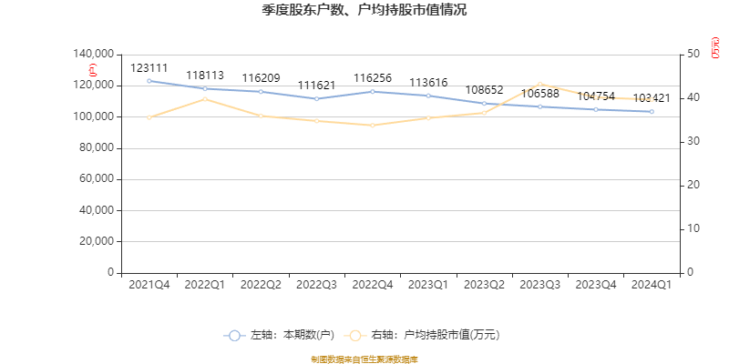 筹码集中度方面,截至2024年一季度末,公司股东总户数为10.34万户,较上年末下降了1333户,降幅1.27%;户均持股市值由上年末的40.2万元下降至39.7万元,降幅为1.26%。