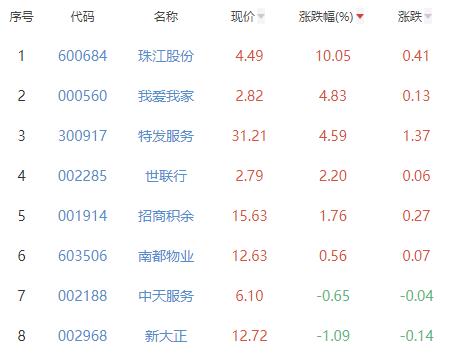其中,珠江股份、我爱我家、特发服务、世联行、招商积余、南都物业、中天服务、新大正涨幅分别为10.05%、4.83%、4.59%、2.20%、1.76%、0.56%、-0.65%、-1.09%。