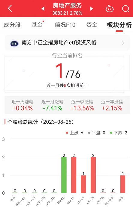 中国经济网北京8月25日讯 今日,房地产服务板块整体涨幅2.78%,其中,6只股票上涨,0只股票平盘,2只股票下跌。
