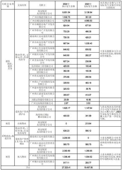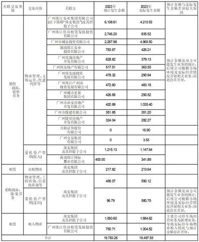 公司2023年日常关联交易预计总额为19,783.26万元,2023年实际发生总额为19,497.55万元。因公司于2023年4月完成重大资产置换及重大资产出售,业务性质发生重大变化,2023年预计发生金额中1-3月主要为房地产业务(包括置出资产)的实际发生金额,4-12月主要为广州珠江城市管理服务集团股份有限公司(置入资产)的预计发生金额,具体如下: