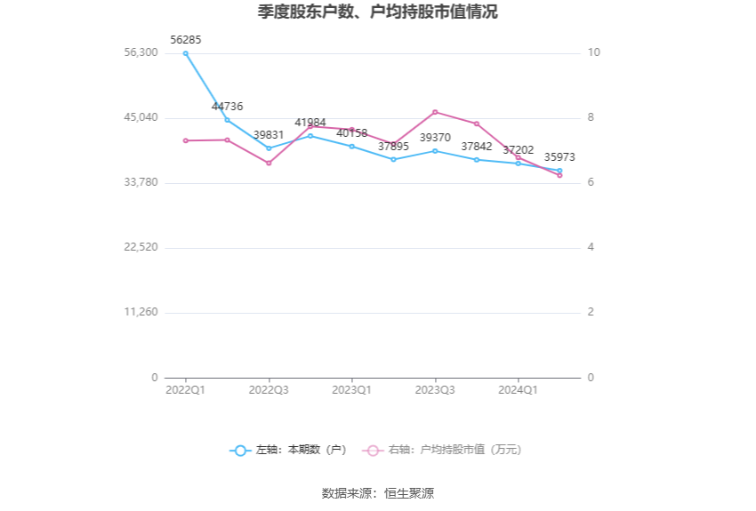 筹码集中度方面,截至2024年上半年末,公司股东总户数为3.6万户,较一季度末下降了1229户,降幅3.30%;户均持股市值由一季度末的6.79万元下降至6.24万元,降幅为8.10%。