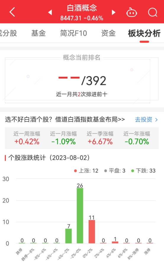 中国经济网北京8月2日讯今日,白酒概念板块整体跌幅0.46%,其中12只股票上涨,3只股票平盘,33只股票下跌。