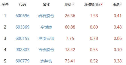 其中,岩石股份、今世缘、华创云信、吉宏股份、水井坊位列板块涨幅前五位,涨幅分别为1.58%、0.80%、0.78%、0.55%、0.52%。