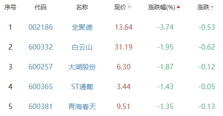 全聚德、白云山、大湖股份、ST通葡、青海春天位列涨幅榜后五位,涨幅分别为-3.74%、-1.95%、-1.87%、-1.43%、-1.35%。