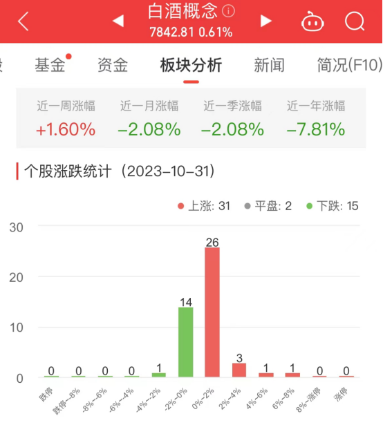 中国经济网北京10月31日讯今日,白酒概念板块整体涨幅0.61%,其中31只股票上涨,2只股票平盘,15只股票下跌。