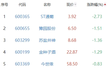 ST通葡、豫园股份、苏盐井神、金种子酒、今世缘位列涨幅榜后五位,涨幅分别为-2.73%、-1.51%、-1.36%、-1.29%、-0.83%。