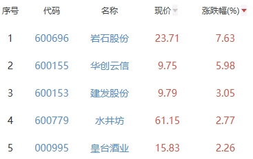 其中,岩石股份(维权)、华创云信、建发股份、水井坊、皇台酒业(维权)位列板块涨幅前五位,涨幅分别为7.63%、5.98%、3.05%、2.77%、2.26%。