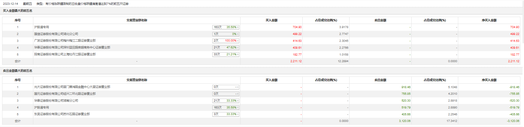12月14日,岩石股份今日跌停,全天换手率达2.68%,振幅达6.53%。龙虎榜数据显示,营业部席位合计净卖出908.94万元。其中,光大证券厦门展鸿路金融中心大厦证券营业部、国元证券绍兴二环北路证券营业部分别卖出918.46万元、755.85万元;沪股通专用、国信证券湖北分公司分别买入704.90万元、499.22万元。