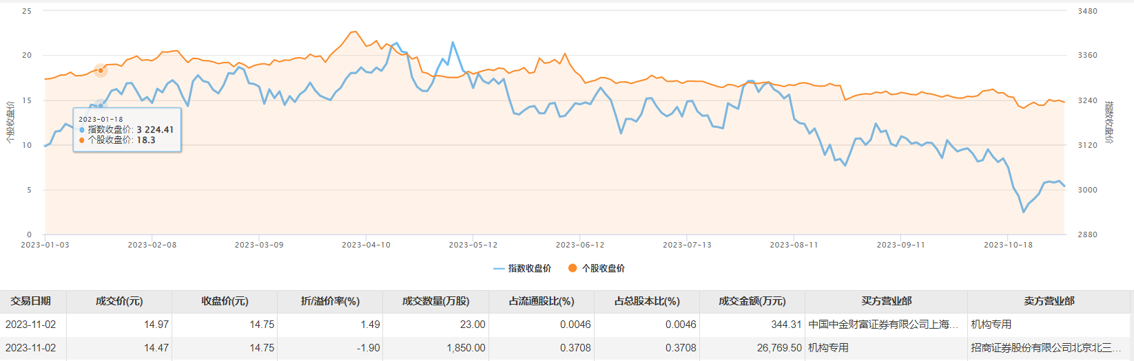 11月2日大宗交易成交1873万股,成交额2.71亿元,占当日总成交额的47.06%,成交均价14.48元,较市场收盘价折价1.83%,其中最高成交价14.97元,最低成交价14.47元。