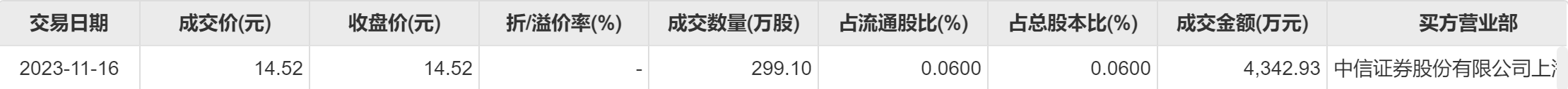 11月16日大宗交易成交299.1万股,成交额4342.93万元,占当日总成交额的8.15%,成交价14.52元,较市场收盘价14.52元持平。